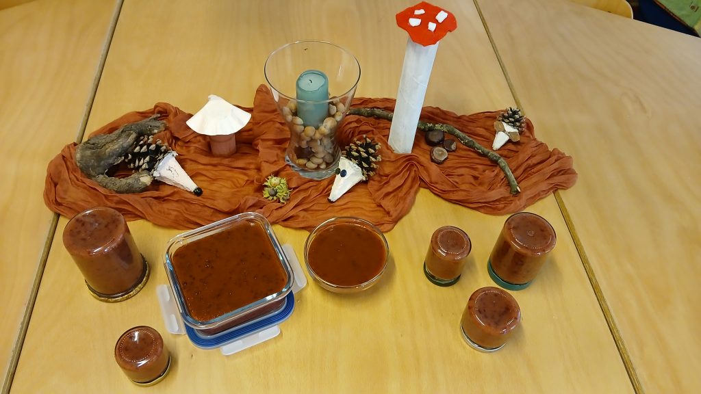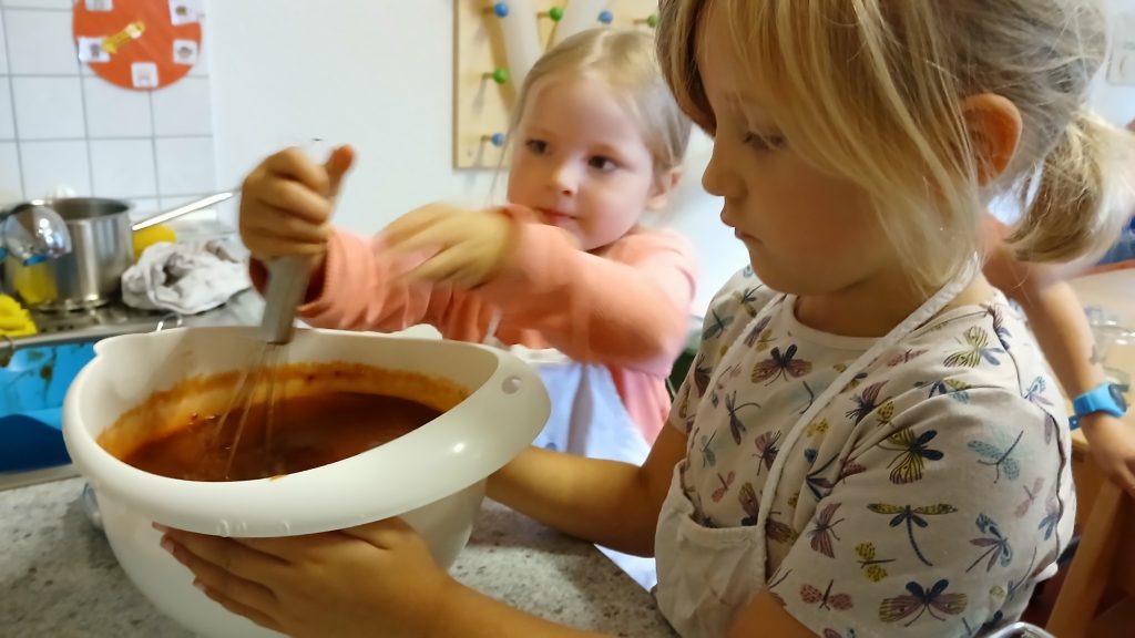 Auch in der Küche wird es herbstlich: Aus saftigen Pflaumen kochen wir gemeinsam eine leckere Pflaumenmarmelade. Die Kinder dürfen waschen, schneiden, rühren, schnuppern und natürlich auch probieren. So wird aus Obst ein kleines Genussprojekt.