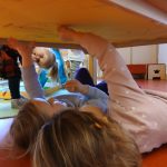 Ein Raum der Wohneinheit ist als Bewegungsraum gestaltet. Hier finden die Kinder feststehende und variable Bauelemente, Schaukelgelegenheiten, schräge Ebenen, Bälle, Bewegungskreisel, Miniscooter und vieles mehr, um bewegende Erfahrungen zu machen. Möchten die Kinder dann eine Pause einlegen, bietet sich ein Entspannungsbereich an, der mit Matratzen, Kissen und einem Kuschelkörbchen eingerichtet ist.