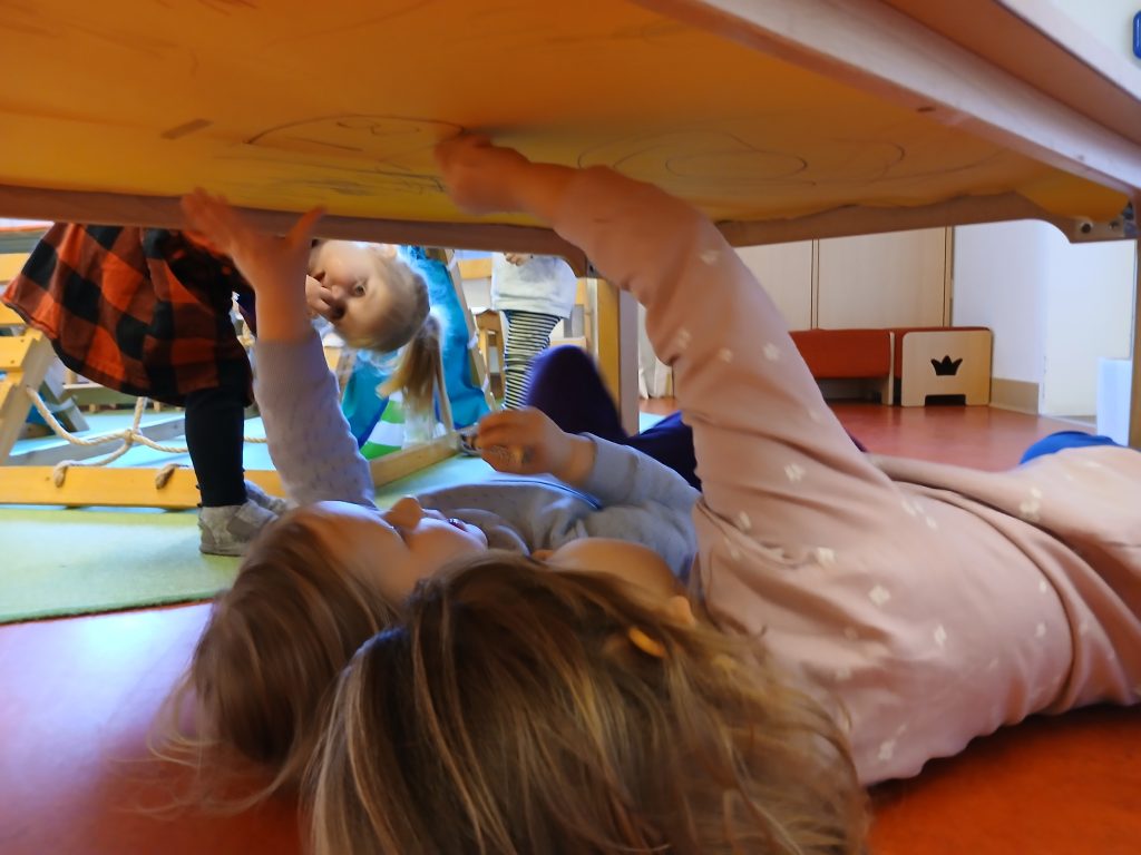 Um den noch sehr jungen Kindern Schutz und Geborgenheit zu geben, sind alle Räume der Gruppe zu einer Wohneinheit miteinander verbunden. Auch zum Mittagessen und zum Schlafen muss dieser Bereich nicht verlassen werden.