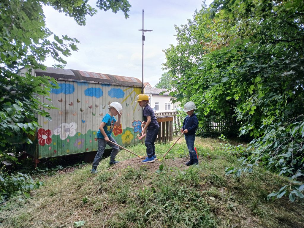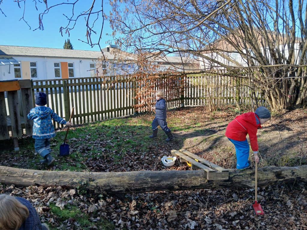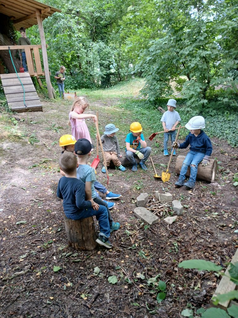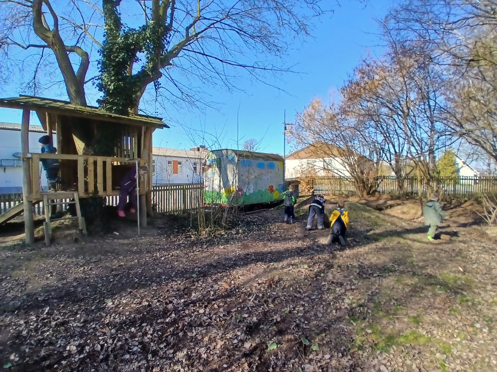 Die Kinder finden Baumscheiben, Stämme, Äste, Gestrüpp, Steinscherben und vieles, vieles mehr, sie beobachten Käfer, Asseln, Ameisen und sonstiges Getier, das hier lebt, buddeln Regenwürmer aus, geben sie von Hand zu Hand und bewundern sie.